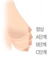 A단계 유방하수는 유두가 가슴 밑 주름 수준이나 이보다 1cm 이내로 내려간 경우를 말합니다 . B단계 유방하수는 유두가 가슴 밑 주름보다 1-3cm 정도 내려가 있지만 가슴조직의 가장 아래보다는 위에 있는 경우를 말합니다 . C단계 유방하수는 유두가 가슴 밑 주름보다 3cm 이상 내려가 있어 유두가 아래로 향하고 있는 경우를 말합니다 . 수술방법